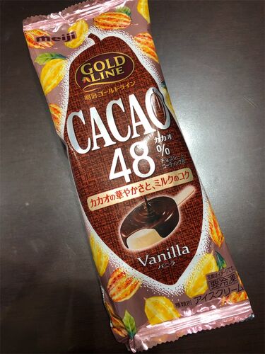 明治ゴールドライン カカオ48% バニラ 90点 パリパリチョコレートコーティングがバニラアイスクリームを包み込む。 頬張ると一気に砕けて唇にも歯にも舌にもまとわりつき、味わう中でもパキパキグムグムと小気味好い触感を堪能できる。 カカオ48%でもチョコ…