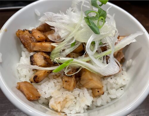 『らーめんONE』の詳細は以下の記事を参照↓ https://gurunabb.hatenablog.com/entry/2019/01/20/100032 チャーシュー丼 100点 丼メニューの一つ。 小ぶりの丼の中に白米150gほど、その上にチャーシュー、そして長葱と小葱をのせている。 チャーシューは豚ロ…
