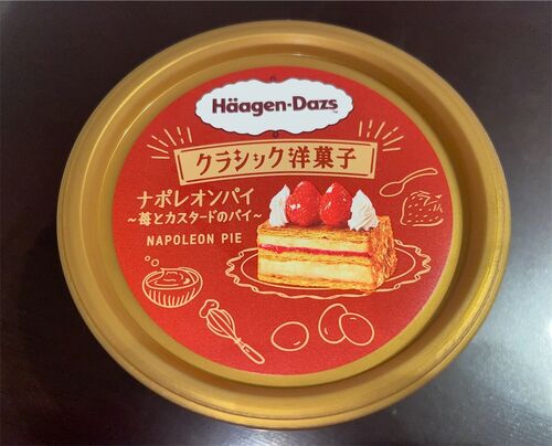 ハーゲンダッツ ナポレオンパイ 100点 ハーゲンダッツによるクラシック洋菓子、ナポレオンパイがカップアイスとして登場。 蓋を開けると所狭しと敷き詰められた細かなパイ生地、そしてその下には苺ソースとカスタードのアイスが鎮座している。 アイスは固め…