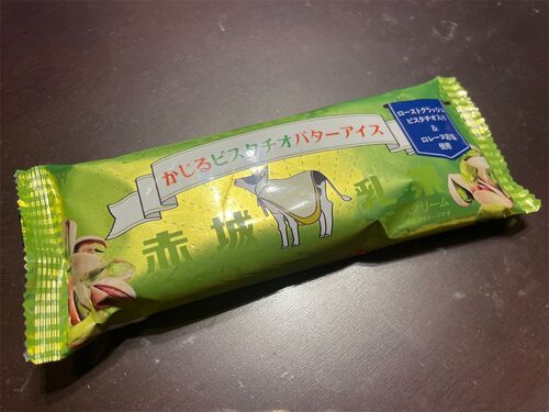 赤城乳業 かじるピスタチオバターアイス 95点 赤城乳業の“かじるシリーズ”のピスタチオバージョン。 封を開ければライトグリーンのバーアイス、ピスタチオバターアイスが角柱となり、中にはローストクラッシュピスタチオが散りばめられている。 むっしりとし…