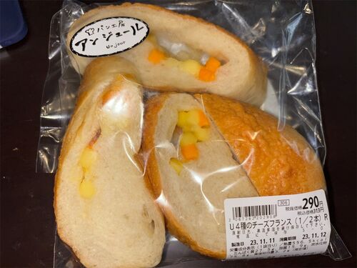 『パン工房 アンジュール』の詳細は以下の記事を参照↓ https://gurunabb.hatenablog.com/entry/2023/08/01/100000 U4種のチーズフランス(1/2本) 100点 惣菜パンのひとつ。 人気の商品の様であり、チーズ入りフランスパンのハーフサイズで、丸ごと込められ…