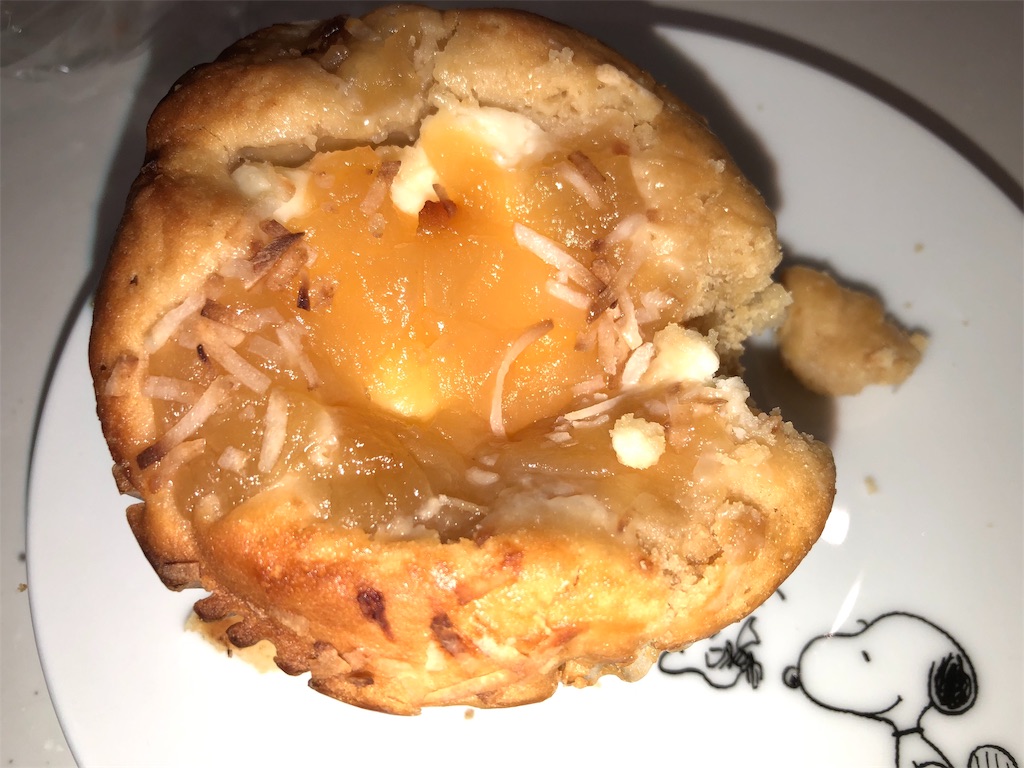 プレーン生地の中心にレアチーズをたっぷり乗せ、上にはダイスカットされたリンゴとココナツを散りばめたマフィン。