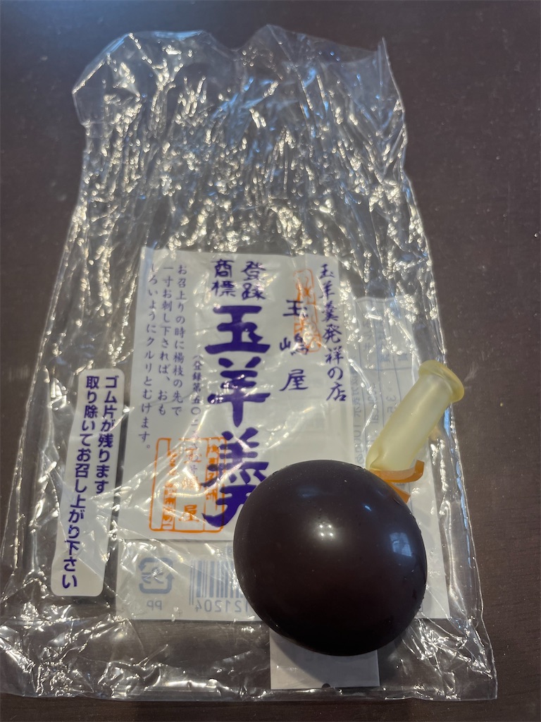 袋は薄いゴム状で、丸みの頂点部分を楊枝で突き刺して羊羹を押し出すと、つるん、ぷるんと羊羹が顔を出す。